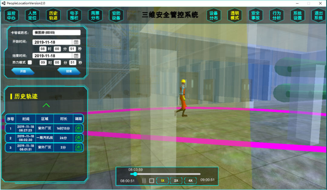 歷史軌跡通過(guò)單人、多人以及熱力圖模式對(duì)歷史軌跡進(jìn)行查詢。多維度數(shù)據(jù)及查看方式方便變電站管理人員對(duì)位置歷史數(shù)據(jù)進(jìn)行有效分析和利用。